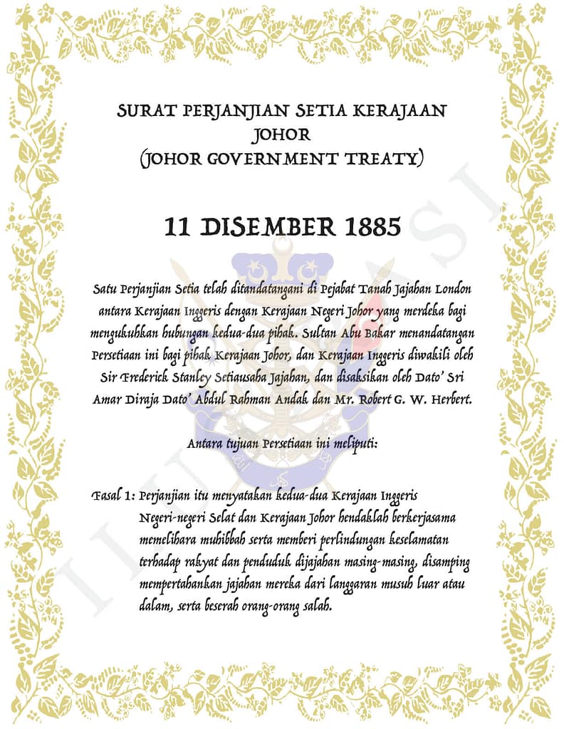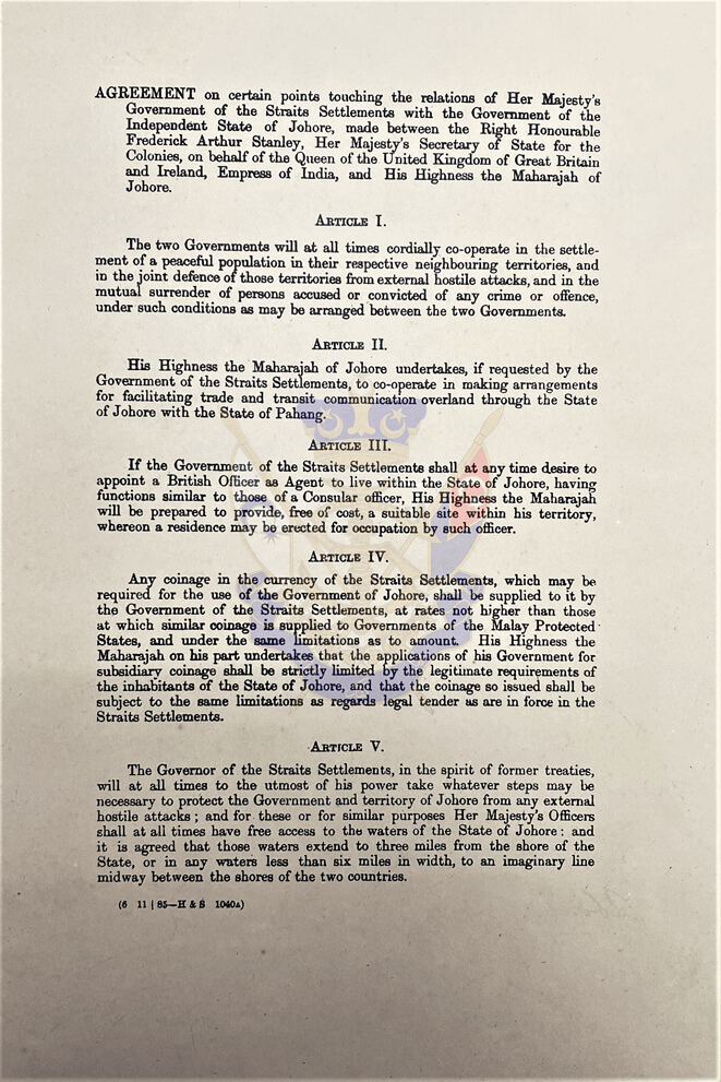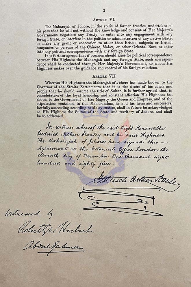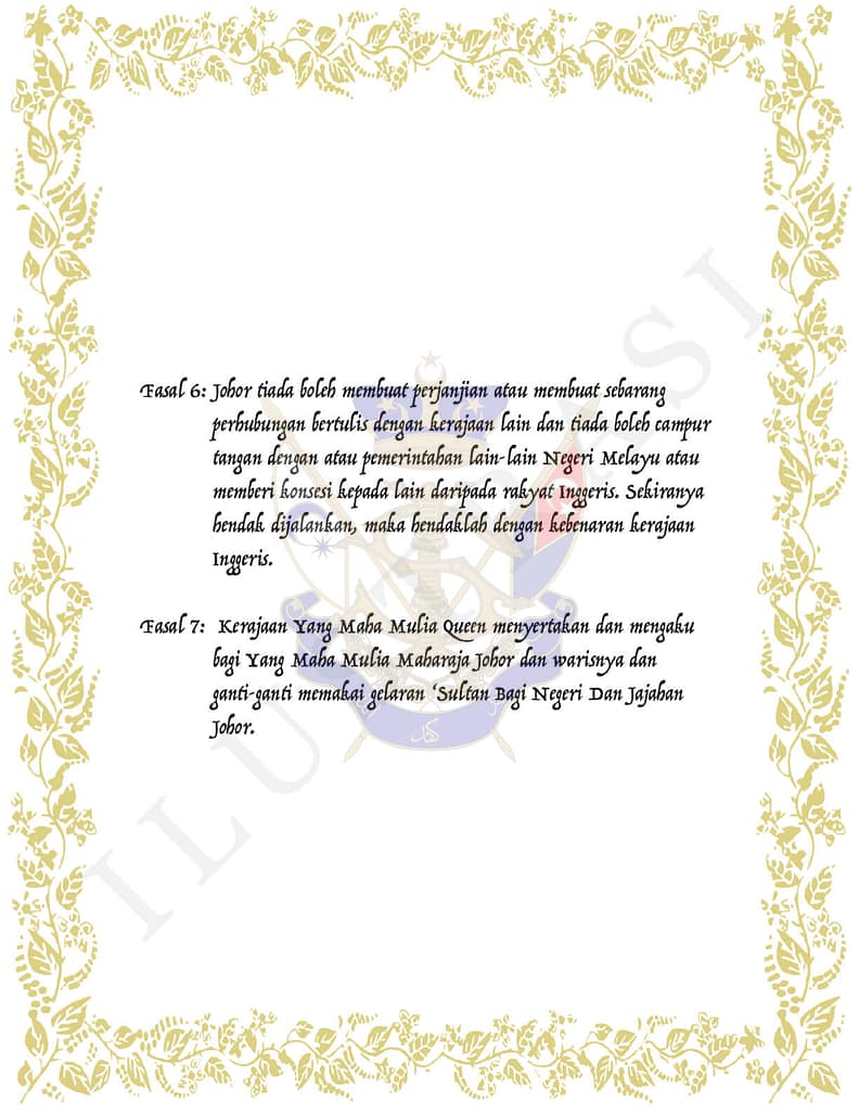 Fasal 7 :Â Kerajaan Yang Maha Mulia Queen menyertakan dan mengaku bagi Yang Maha Mulia Maharaja Johor dan warisnya dan ganti-ganti memakai gelaran “Sultan bagi Negeri dan Jajahan Johor”.