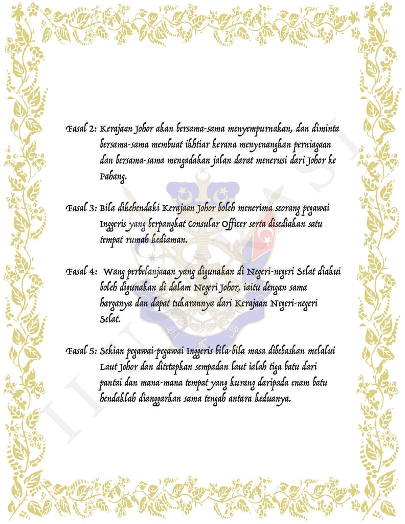 Fasal 3 : Apabila dikehendaki, Kerajaan Johor boleh menerima seorang pegawai Inggeris yang berpangkat Consular Officer serta disediakan satu tempat rumah kediaman.